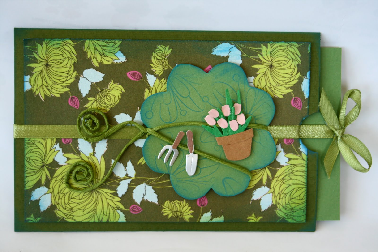 Вчера разбрах , че има и летен Никулден и направих тази картичка за баща ми . Тъй като е цветар , саксията с градинарските инструменти бяха точно като за него , пък и отдавна исках да ги използвам . Този тип картички (издърпва се листчето за панделката) много ми харесва , не знам как им се казва точно …