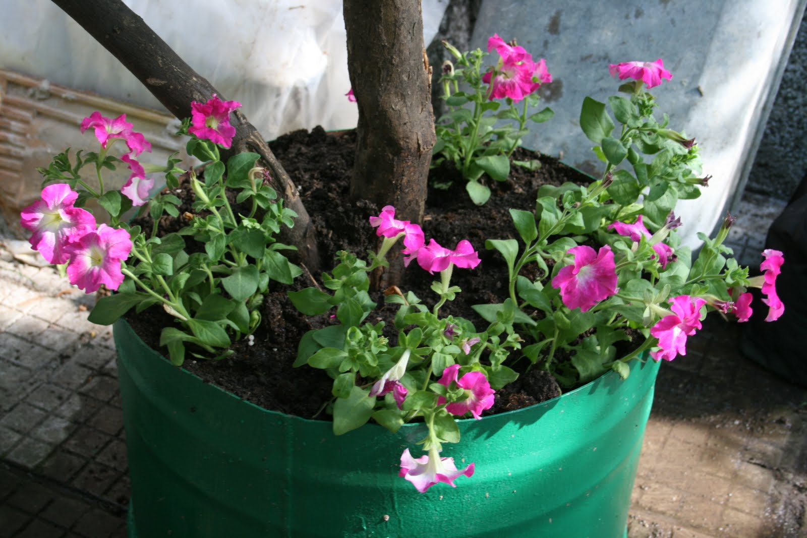 Боядисах контейнера на лимона , малко петунии за цвят и стана много по-красиво от преди . Само дето забравих да снимам и лимона в цял ръст , той е доста голям , точно е навързал и лимони . Аз лимони с по-дебела кора не съм виждала никъде , 1 см поне е кората , но така миришат , усеща се мириса на лимон като минеш по пътеката 🙂 .