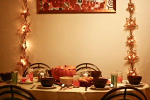 Масата ни , в тиквата “супник” беше тиквената крем супа по рецепта на Бон Апети , аз добавих и индийско орехче , малко настъргани моркови за украса отгоре и кротони .