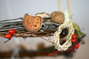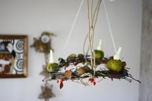 Полюлеят , който направих . Използвах лозови пръчки и пръчни от растение , чието име не знам , но пък много лесно се огъваха , та затова главно то влезе в употреба . Шипките и разните джунджурии по полюлея ги взех от магазина (“Цветарница Галя”) , а тиквичките са лично производство на баша ми .