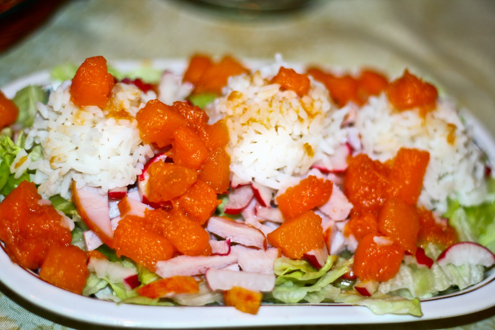 Салата с айсберг , репички , филе , ориз и карамелизирана тиква